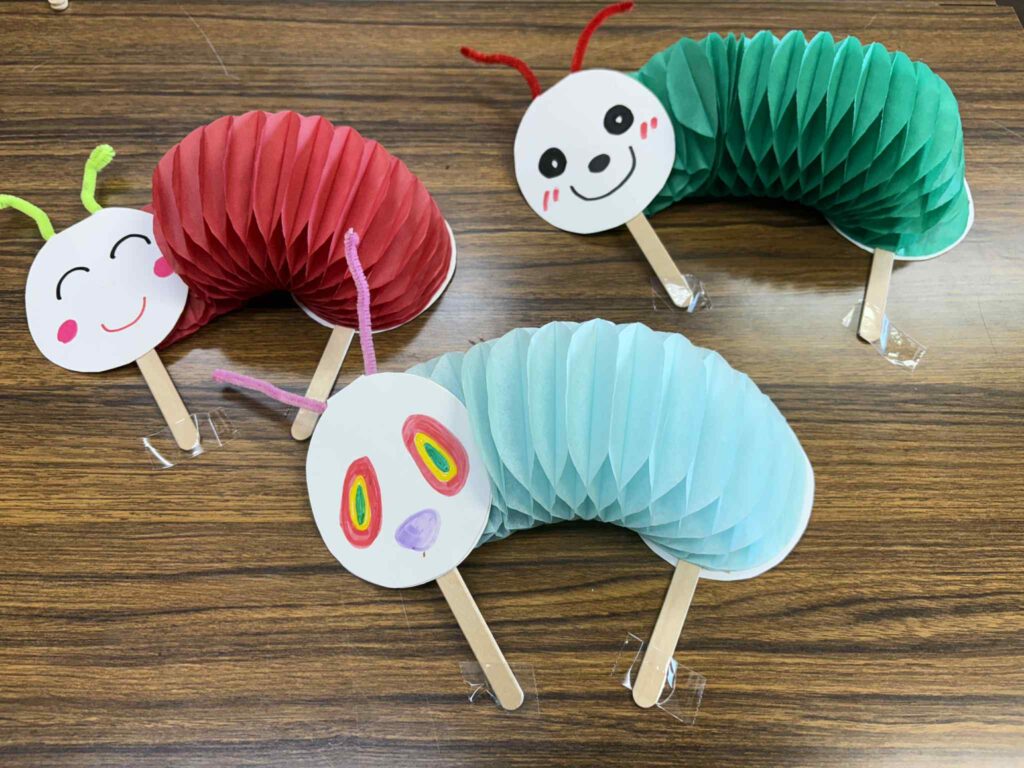 簡単手作りおもちゃのワークショップです。カラフルな動くあおむしを作ります。可愛いお顔を描いてね。